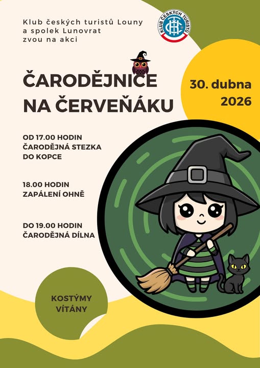 30. dubna od 17.00 hodin bude připravena čarodějná stezka do kopce, v 18.00 hodin zapálíme oheň a až do 19.00 hodin budeme společně tvořit v čarodějné dílně.